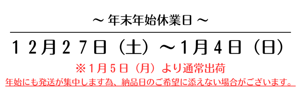 1月5日(月)から通常通りの営業となりますが、年始にも発送が集中する為、納品日のご希望に添えない場合がございますことをご了承ください。