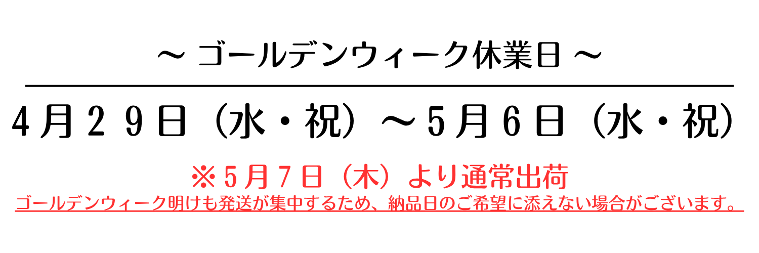 5月7日(木)から通常通りの営業となりますが、ゴールデンウィーク明けで発送が集中する為、納品日のご希望に添えない場合がございますことをご了承ください。